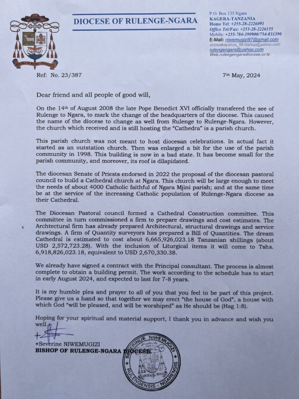 Mhashamu Askofu Severine Niwemugizi wa Jimbo Katoliki Rulenge-Ngara kwa Unyenyekevu Anakukaribisha ewe Mkristo Mkatoliki na Yeyote Mwenye Mapenzi Mema kushiriki katika Harambee ya Kuchangia Ujenzi wa Kanisa Kuu la Jimbo Katoliki Rulenge-Ngara.